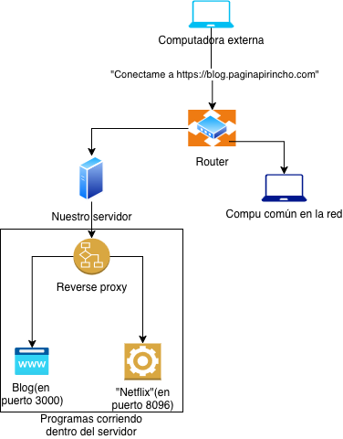 https://blog.paginapirincho.com. - Dentro de nuestro servidor, nuestro reverse proxy recibe ese pedido en el puerto predeterminado (80 o 443, ambos se usan, y nuestro reverse proxy "presta atención" o "escucha" a ambos puertos), busca en su configuración las instrucciones de qué hacer con esa página, encuentra que hay que redirigir hacia el puerto 3000 y lo hace. Le pide al programa del blog que le dé el blog, el programa se lo da al reverse proxy, que se lo da al router, que finalmente le llega a la computadora, externa.