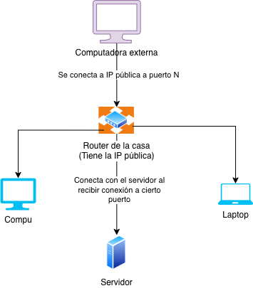 Sin embargo, para poder acceder nuestra computadora desde afuera, necesitaríamos poder indicar de alguna forma al router, que recibiría la conexión, que "derive" el pedido de la computadora de afuera a una computadora en específico, en este caso nuestro servidor. De esta manera, cuando una computadora externa (como, por ejemplo, nuestro celular cuando no estamos conectadxs a la red wifi o local) se conecta a nuestra IP pública, nuestro router la guía a la IP local de nuestra red.