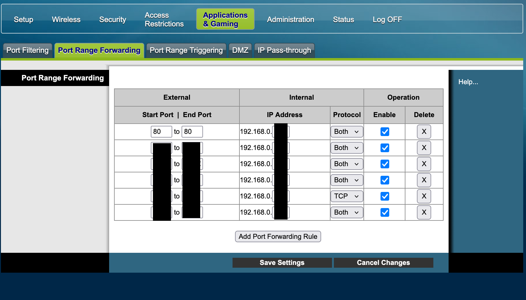 En este menú, podemos ver cómo le puedo indicar al router, cuando recibe una conexión externa en un puerto específico(en mi caso un rango de puertos), que la redirija a una IP local en particular.