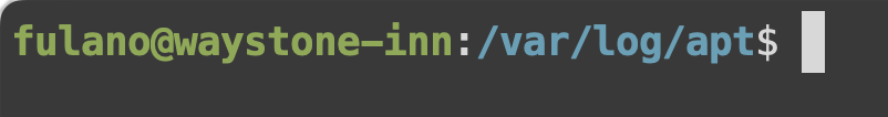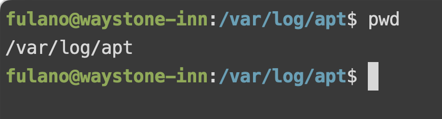 Nos estaría indicando que no estamos trabajando el el directorio "home" de nuestro usuario, sino en el directorio que se encuentra en la ruta /var/log/apt. Si corriésemos el comando pwd, por más redundante que sea, nos mostraría como resultado que, en efecto, ese es el "camino" hacia la carpeta en la que estamos trabajando, y que la consola da por sentado que estamos corriendo el comando desde esa ubicación en los directorios del sistema: