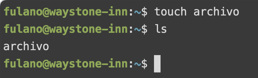 De la misma forma, y volviendo al directorio "home" (que figura como un ~ en nuestra consola, para abreviar), si usásemos el comando touch, que sirve para crear un archivo vacío, y se utiliza escribiendo touch <nombre del archivo>, el archivo creado lo encontraríamos en el actual directorio: